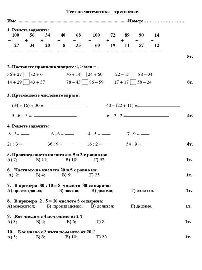 входно ниво тестове по математика за 3 клас за принтиране